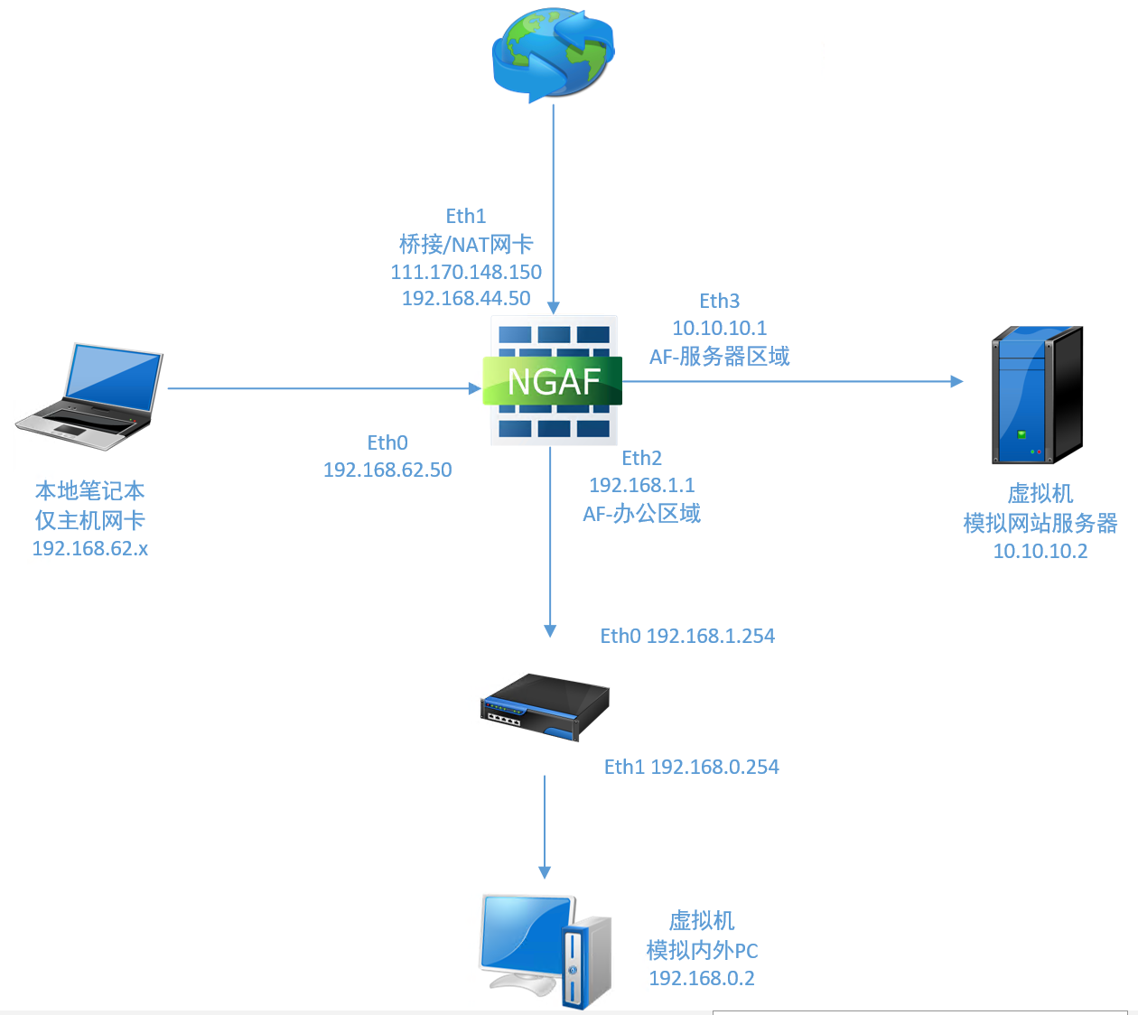 现有的拓扑如下图,使用AF替换现有防火墙部署在出口,实现对内网用户和服务器安全防护。